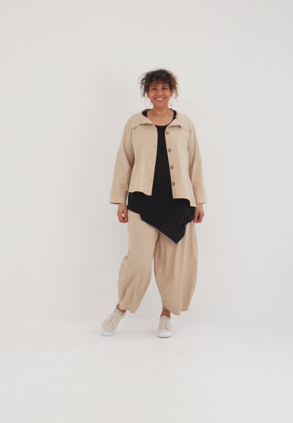 Der Baumwoll-Mix ist dabei das heimliche Highlight: atmungsaktiv, angenehm elastisch und so formstabil, dass du dich den ganzen Tag wohlfühlst – ohne Kompromisse beim Stil. Der asymmetrische Saum sorgt für Bewegung und macht die Bluse besonders schön zu schmalen Hosen, Denim oder – als Set getragen – zur passenden Serena Hose für einen harmonischen, minimalistischen Komplettlook.